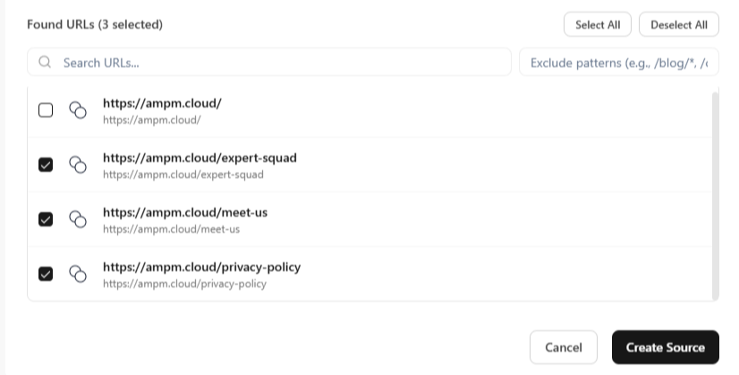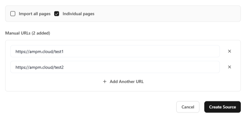 The Website import feature in the "Add Knowledge Sources" modal enables you to train your AI agent using content directly from live web pages. Whether you need to import an entire site structure or just a few specific landing pages, this interface gives you granular control over the data ingestion process.