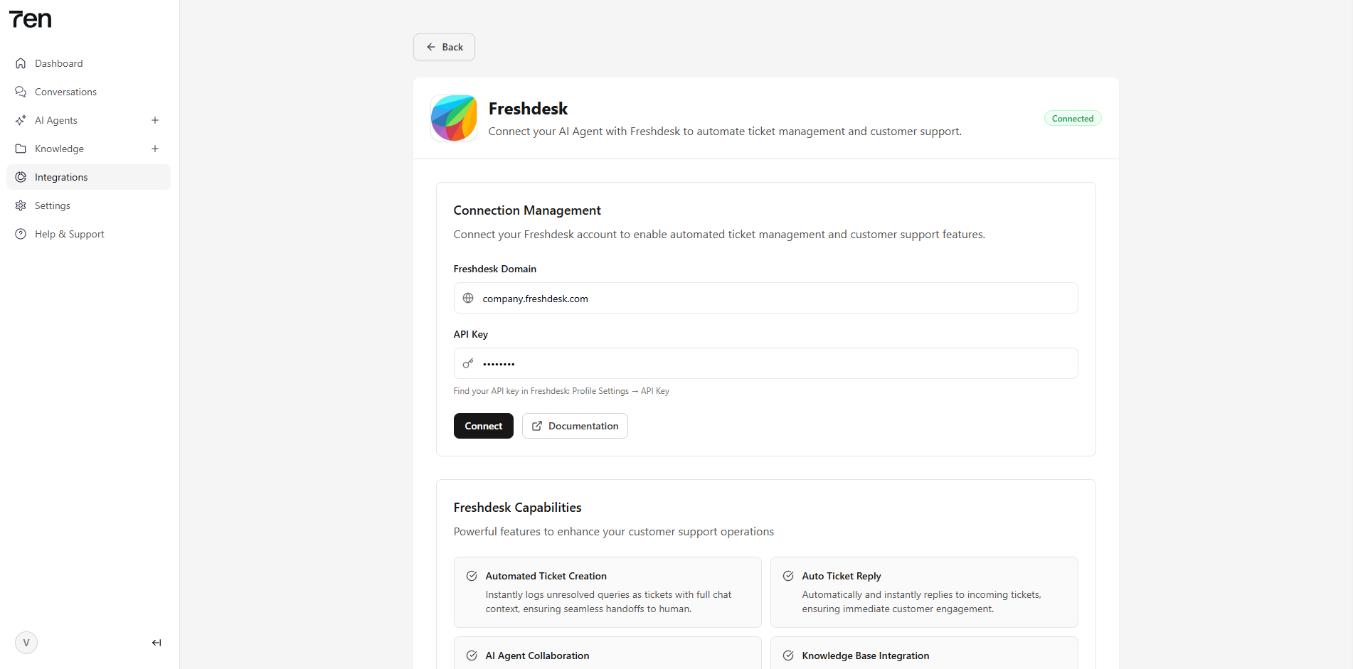 Integrating Freshdesk with 7en.ai allows your AI agents to seamlessly interact with your customer support ticketing system, automating ticket creation and query resolution. This guide provides a clear, step-by-step process to connect Freshdesk to 7en.ai, enabling your agents to streamline support workflows and enhance customer experiences.