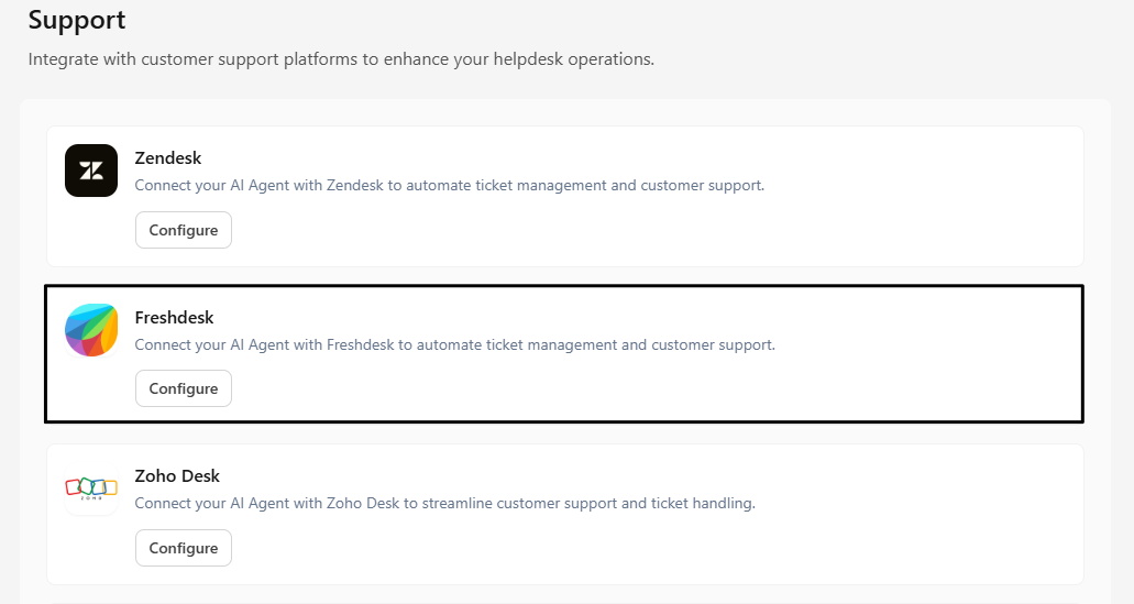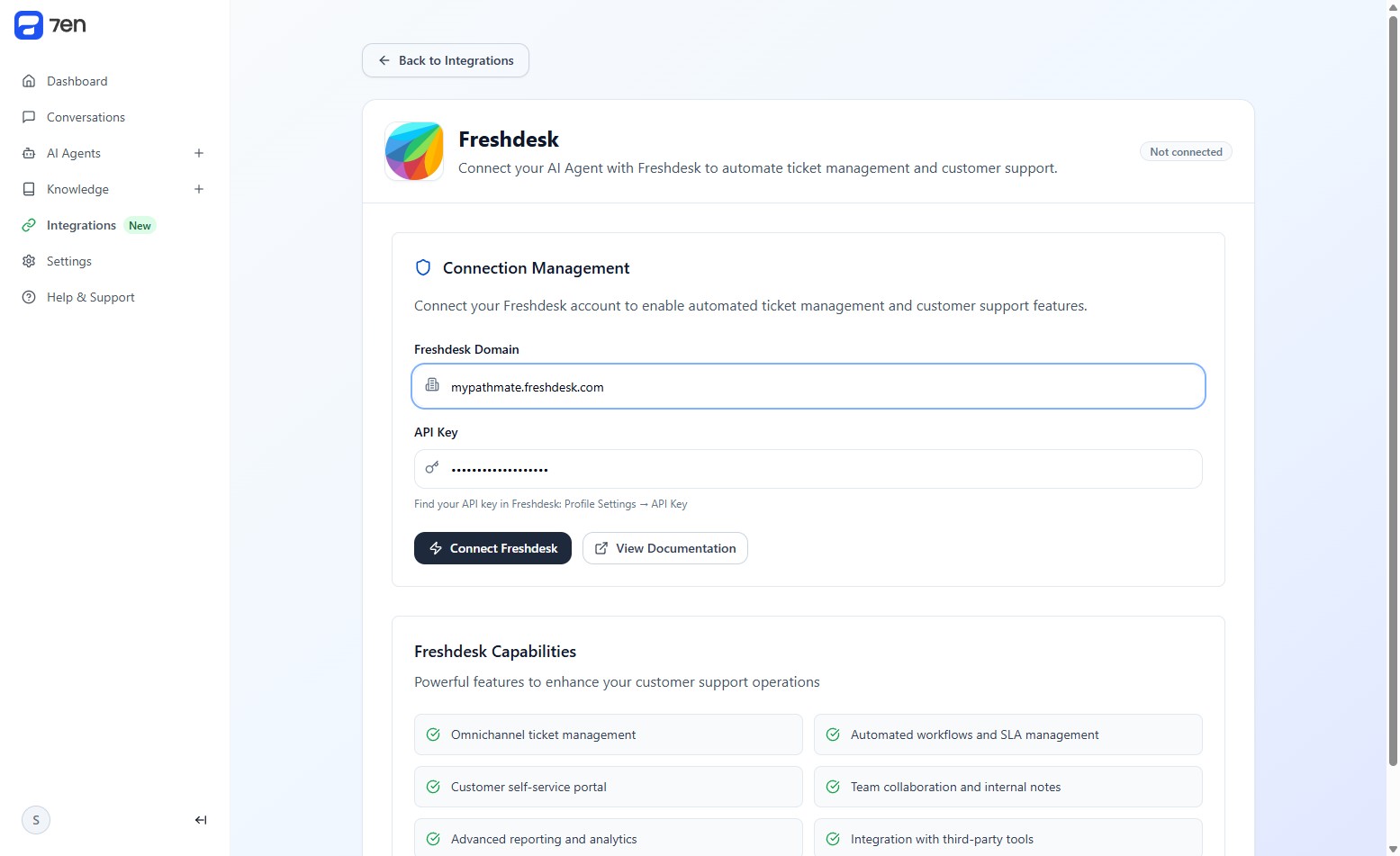 Integrating Freshdesk with 7en.ai allows your AI agents to seamlessly interact with your customer support ticketing system, automating ticket creation and query resolution. This guide provides a clear, step-by-step process to connect Freshdesk to 7en.ai, enabling your agents to streamline support workflows and enhance customer experiences.