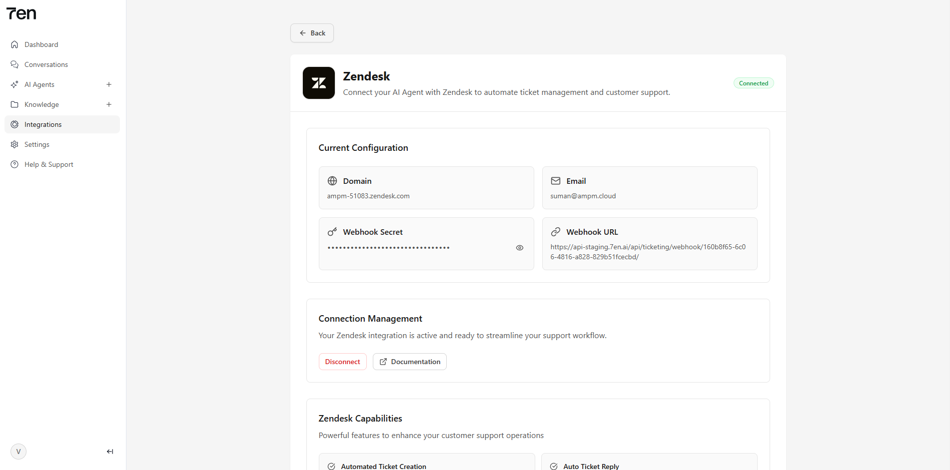 Once connected, you can enable Auto Ticket Reply on any agent — your 7en.ai agent will automatically respond to incoming Zendesk tickets using its trained knowledge, without any manual intervention.
